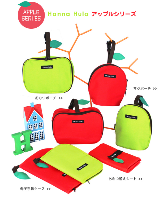 PCやモバイルの画面でもじゅうぶん可愛いのですが、実際のアップルシリーズはマグポーチや母子手帳ケースも含め、丸っこいフォルムがとっっても可愛いです!おむつ替えシートをセットにすると、更に特別感が出てギフトでも喜んで頂けると思います。アップルグリーンも爽やかでこちらも実物は可愛いですので、次回はこちらもぜひご検討下さいませ!